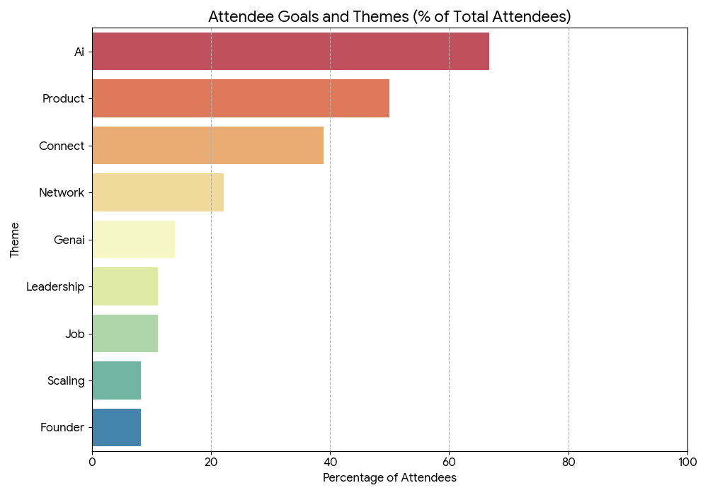 The primary motivation for attendees was clear: practical application of AI and accelerating leadership growth. The stated goals clustered around high-impact, strategic themes: